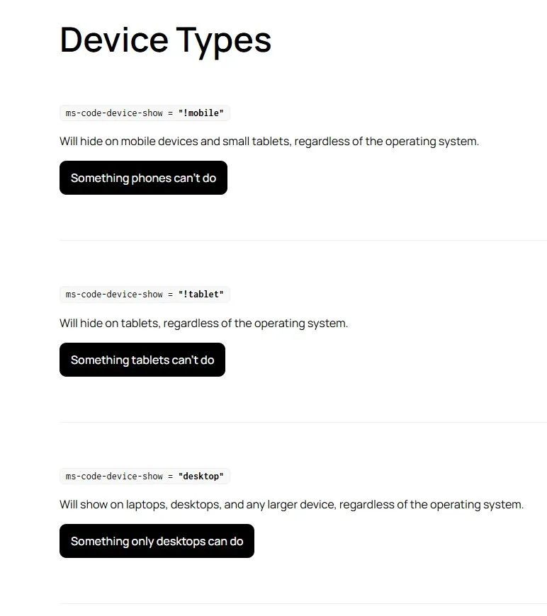 · ms-code-device-show=”portrait&tablet” – this will only display the element on tablets in portrait mode and nowhere else