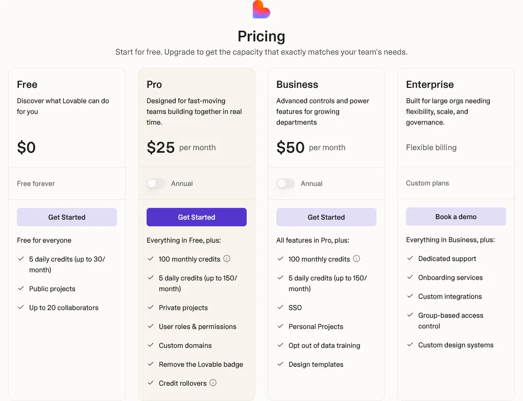Pricing: Offering multiple tiers of pricing from free to enterprise, there is pretty much something for every price range and need set with Lovable. With the intermediate plans ranking at only $25 and $50 a month depending on your needs, you are unlikely to break your budget here! Lovable works on a credit system explained here, that charges partial or full credits per request that are deducted from your total banked number of credits available.