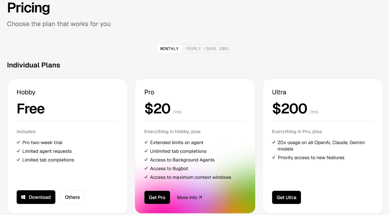 Pricing: Cursor uses a token based system where the tokens represent units of text that are processed by the AI. Cursor’s pricing system is a little more all or nothing with only three levels of plans at Free, $20/month or $200/month.