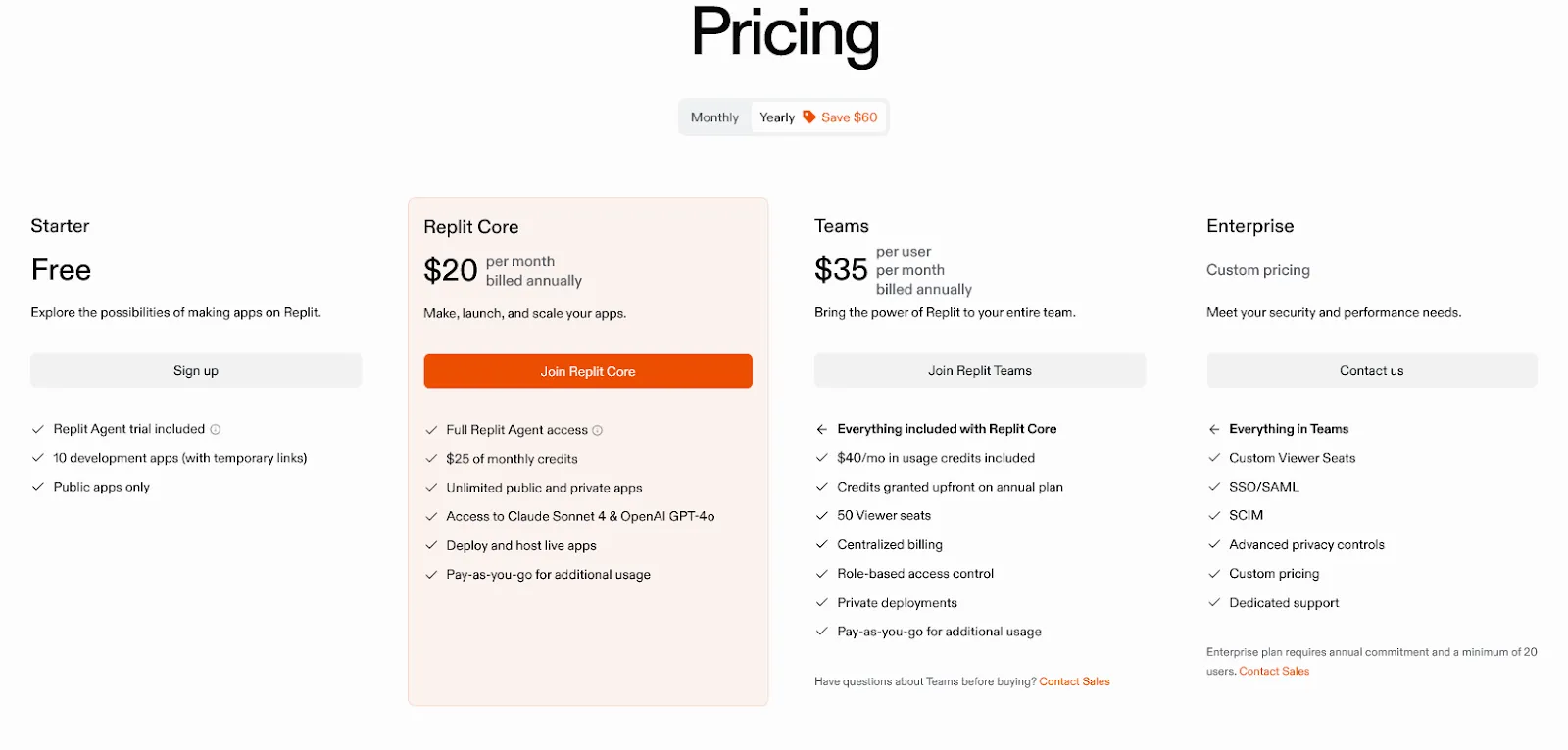 Pricing: Replit stays on the competitive side of the pricing game with three plans between free and $35 a month, and a customizable Enterprise level. Replit also uses credits per interaction, as well as a comprehensive billing and monitoring system to keep you up to date with your current status at all times. They also have a very informative Help Center document about credits and billing that goes into great detail if you are interested in more information.