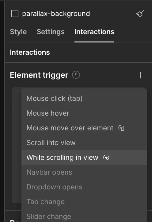 - Add a “While Scrolling in View” interaction to the parallax-section component from the Interaction panel > Element Trigger menu.