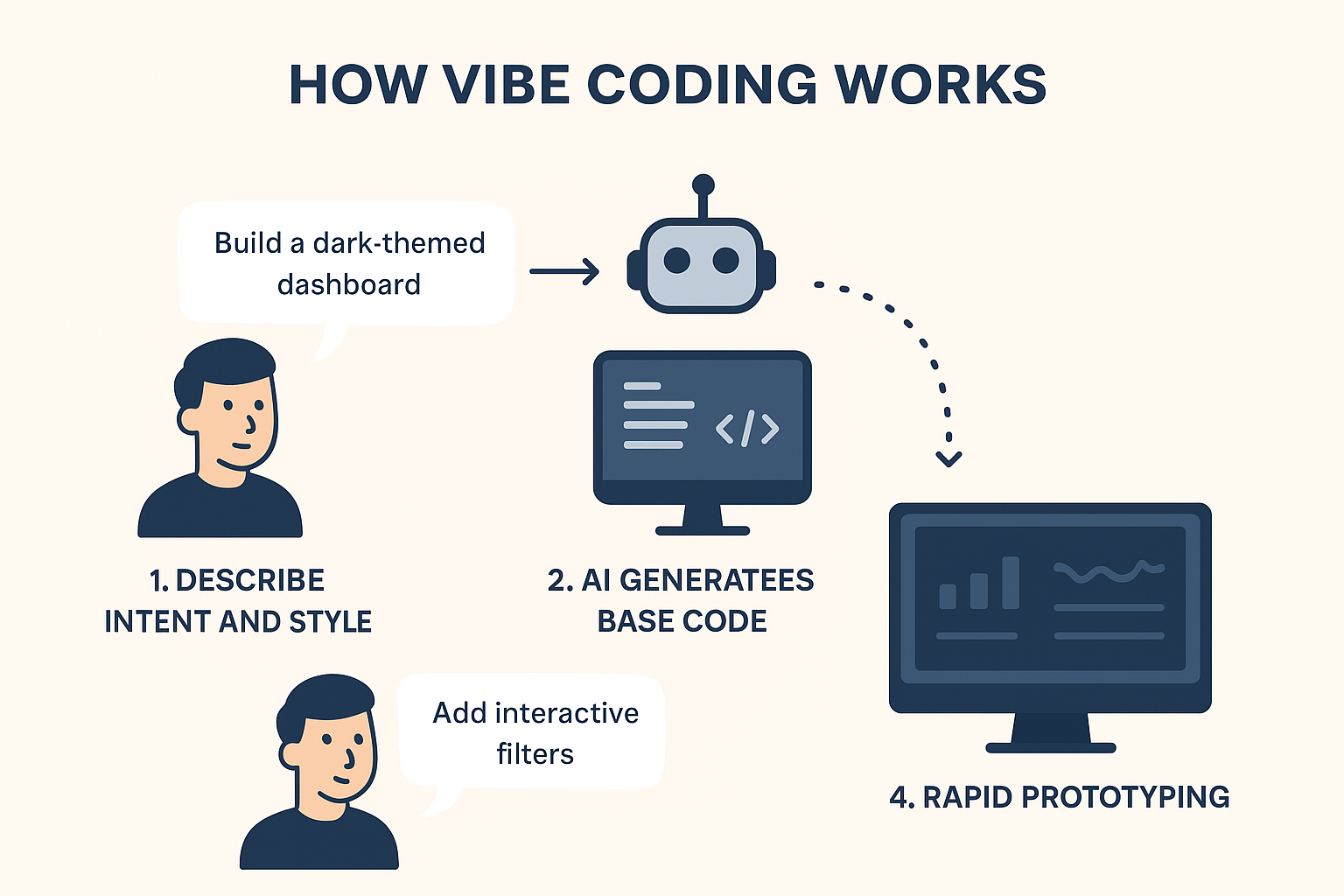 Vibe coding is an AI-assisted development workflow that turns natural language prompts into real code. Instead of writing syntax or dragging elements, users describe what they want: “Build a dark-themed dashboard that shows user activity by region with interactive filters.”