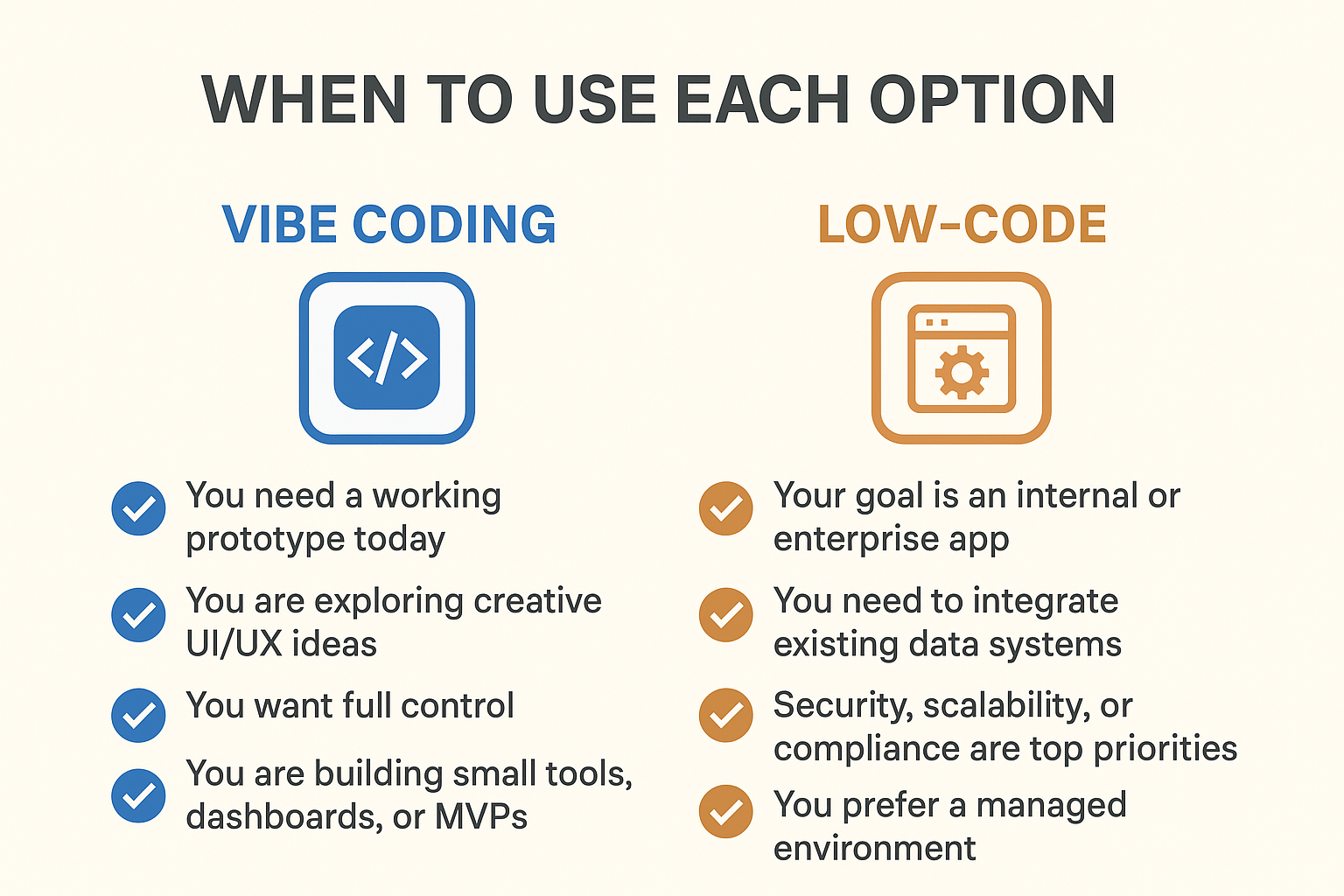 Both methods promise speed, accessibility, and creativity, but they serve different needs. Low-code is structured and enterprise-ready. Vibe coding is flexible, experimental, and powered by AI.