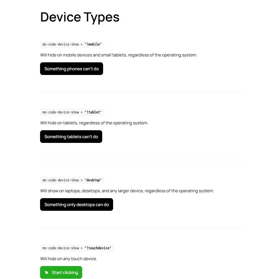 For example, ms-code-device-show=”tablet” will only display the element on tablet devices, while ms-code-device-show=”desktop” will only display it on desktops.