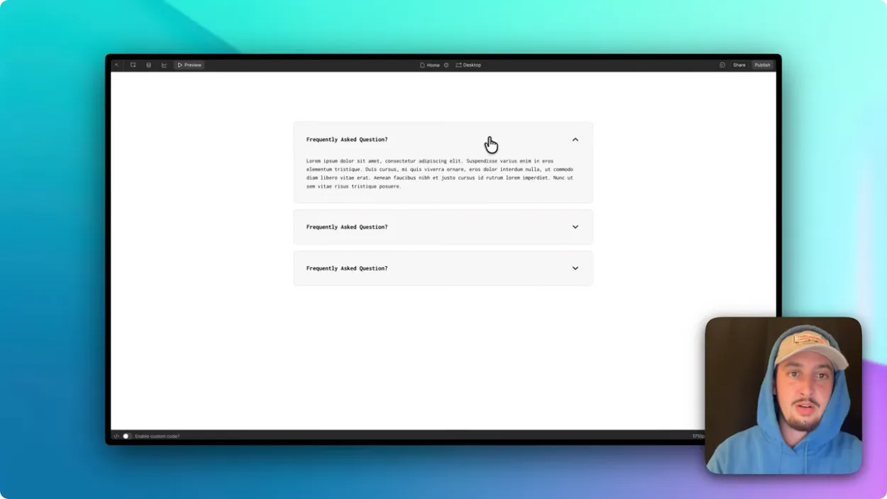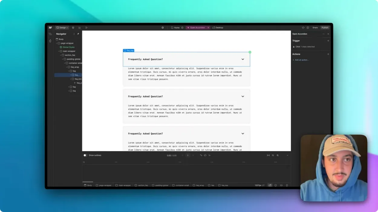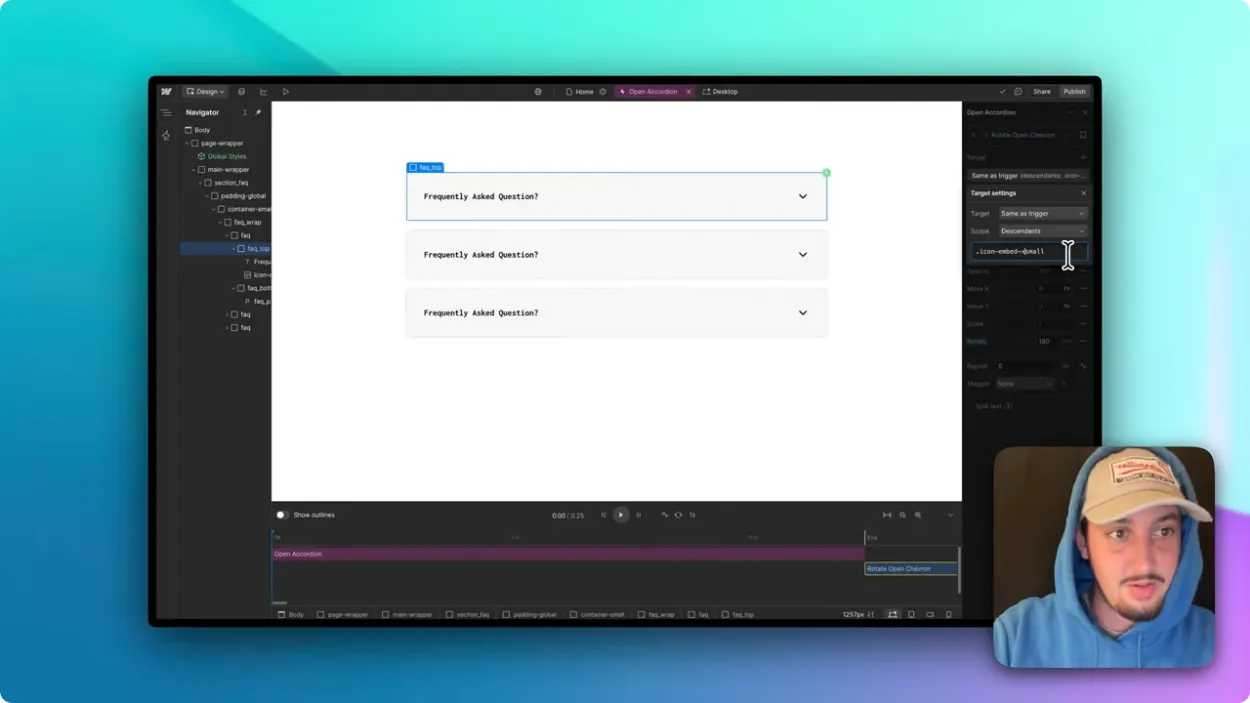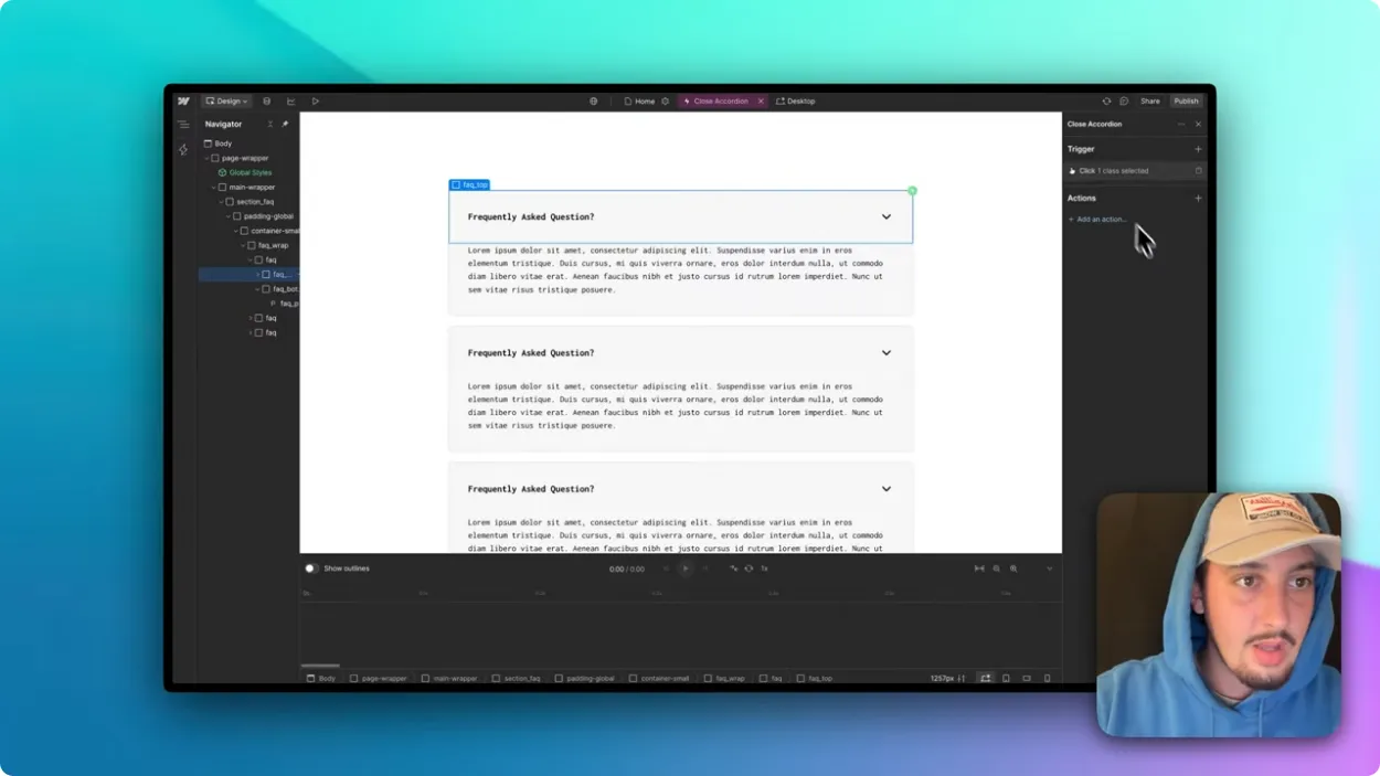 In this tutorial, we walk you through how to build an animated accordion in Webflow using the new interaction tools. You’ll learn how to structure your elements, set up open/close animations, and make your chevron icon rotate dynamically when toggled.