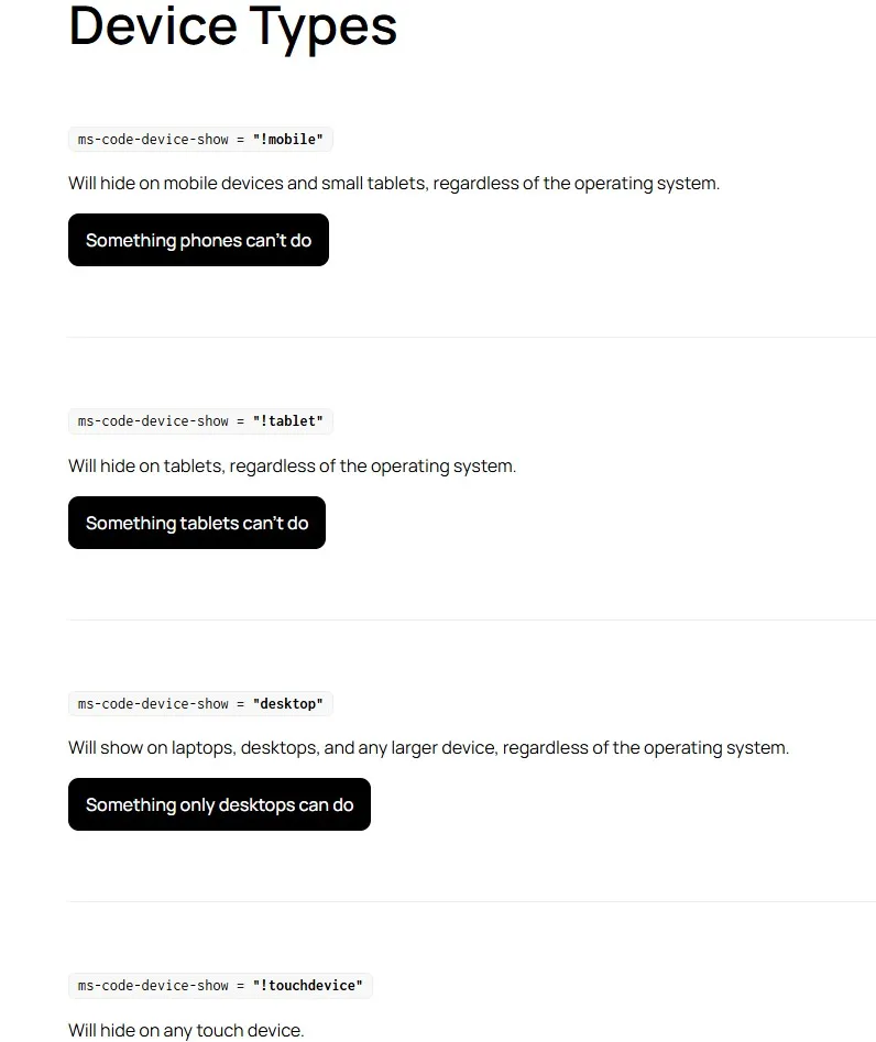 · ms-code-device-show=”ios|macos” – this will only display the element on either iOS or macOS