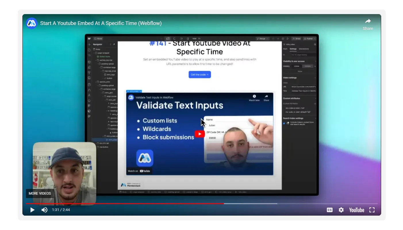 To embed a YouTube video with a timestamp in Webflow, we’re going to use MemberScript #141 – Start YouTube Embed at Specific Time. Follow the link to get the code you’ll need to add to your page and watch a video tutorial on how to set everything up.