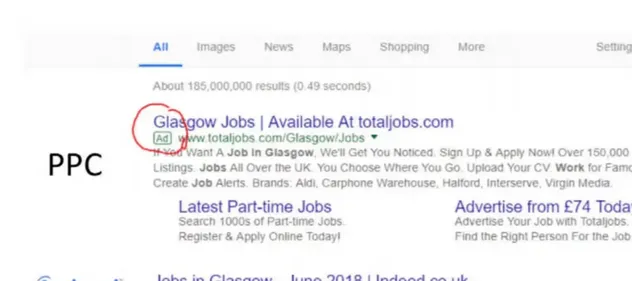 An example of PPC advertising in Total Jobs is seen in the screenshot below. In this example, the word ‘Ad’ is beside the link to indicate its PPC. This is a great way to advertise jobs since you don’t have to worry about ranking low on search engines.