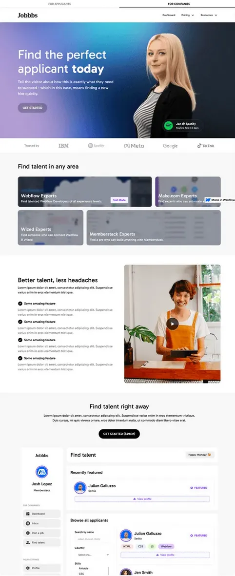 Perform keyword research to see what queries people use to search for jobs, and integrate them into your web pages. Websites built with Webflow are responsive, improving your site’s SEO, which in turn improves your traffic!