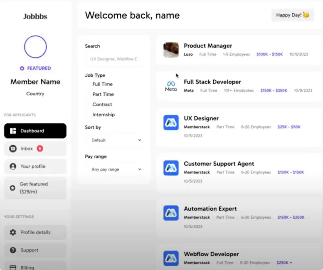 One of the best parts of integrating your website with Memberstack’s user account features is the ability to create custom dashboards for job seekers or hiring companies on the site. This means that each customer will be able to keep track of the jobs they’ve applied for, their portfolio website, and any messages sent within the platform. This is a great way to set your website apart from competitors and encourage customers to purchase more premium features on the site.