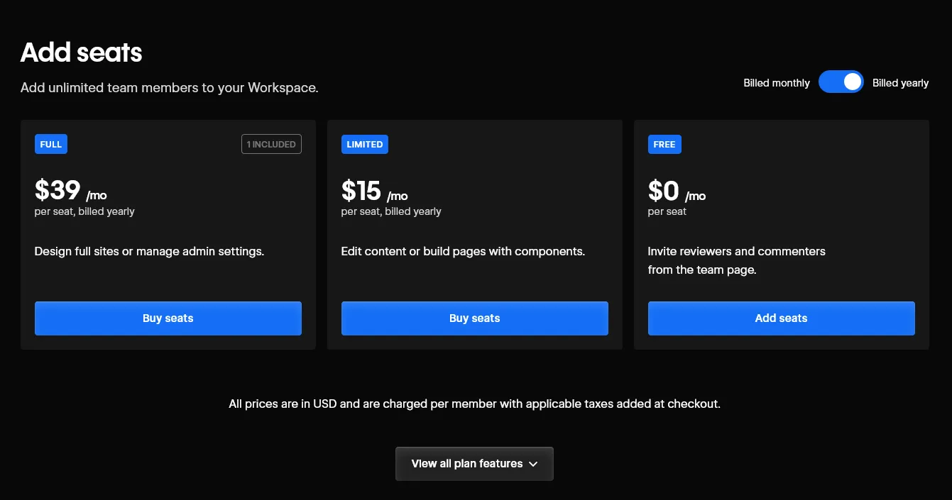 However, alongside paying for a site you will need to pay for a workspace, which starts free, allowing you to have 1 seat and 2 non-custom domain sites, but can go up to a max of $60/seat for a non-enterprise workspace. That’s $720/seat/year billed monthly, or $588/seat/year billing annually.