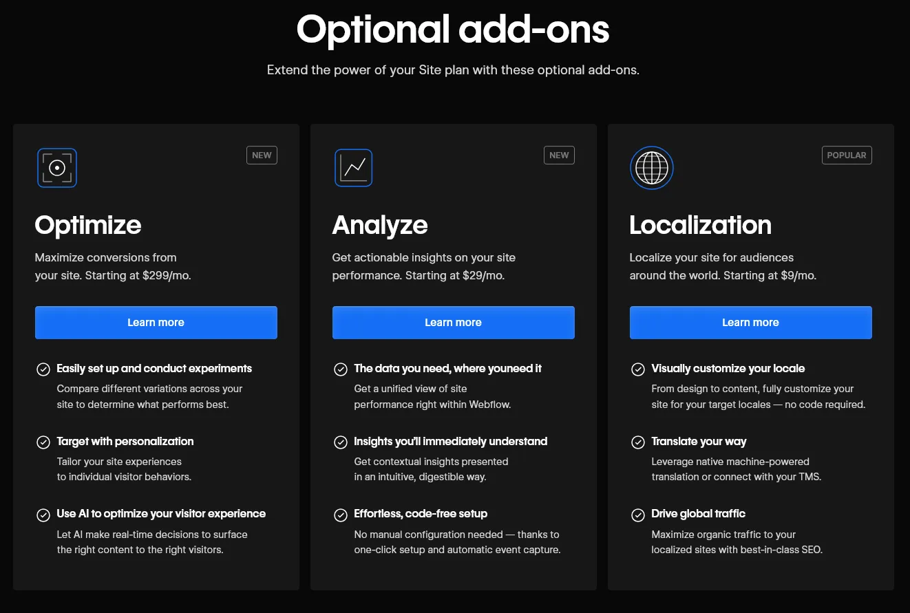 The other major change is that under “Site Plans” Webflow has added a trio of exciting options to help you reach larger audiences, more efficiently and with great ease. They are called them the “Optimize”, “Analyze” and “Localization” options. They cost from as little as $9 a month to $299 a month depending on the level you choose! This is not charging extra for options that were previously included elsewhere. These are completely new services that Webflow is now offering their customers.