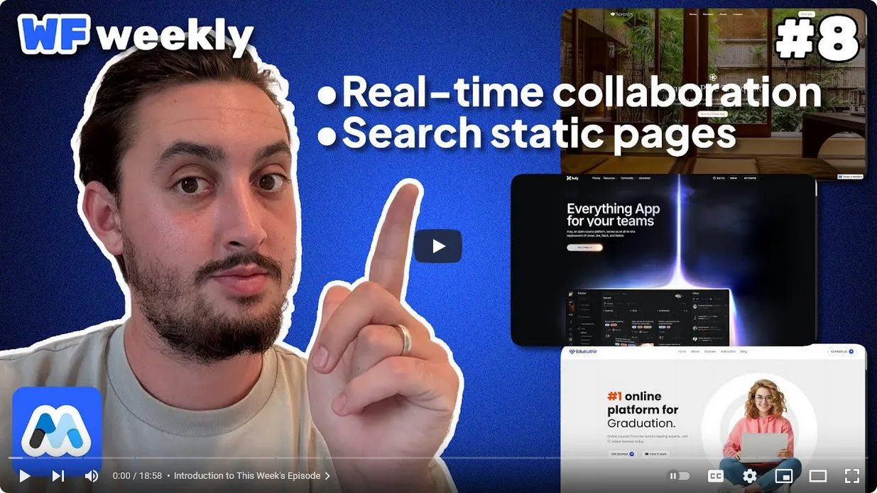 This week on Webflow Weekly, we are diving into the latest game-changing features, including the highly-requested real-time collaboration and a powerful new page search function. We explore four incredible Webflow templates and cloneables, from stunning portfolio designs to a fully-functional spa booking site. Plus, we'll take a first look at a new Webflow app designed to solve all your booking needs.