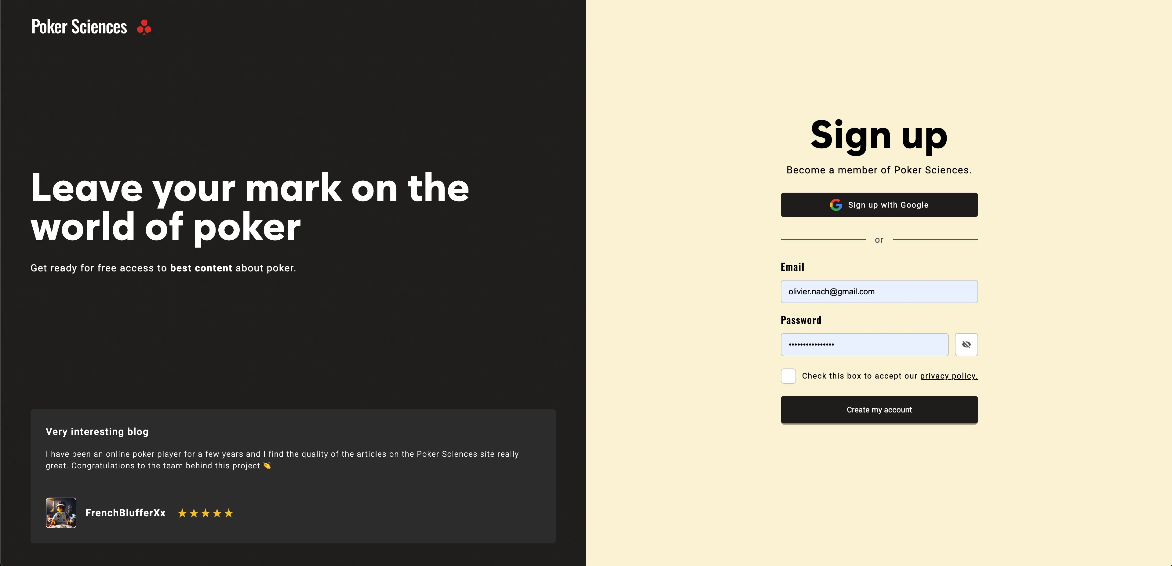 I created this poker site with a friend. We are two French poker enthusiasts (the site is available in both French and English), and we wanted to create a site to help beginner, intermediate, and even advanced players improve their poker skills.
