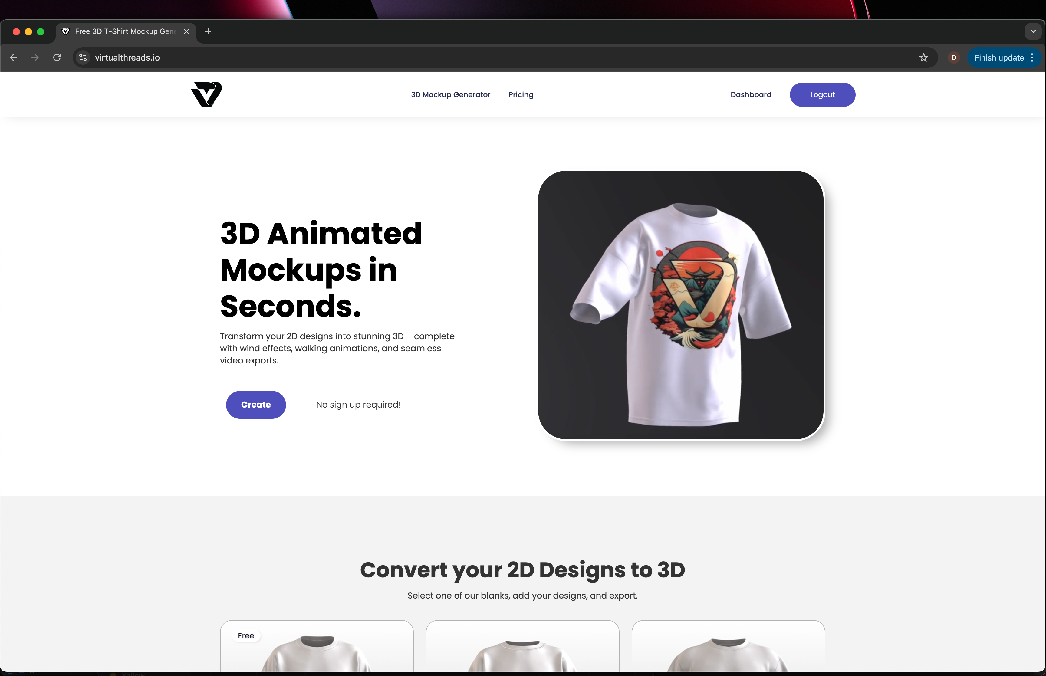 Transform your 2D designs into 3D animated mockups in seconds with VirtualThreads.io, the ultimate 3D mockup generator for clothing brands and graphic designers. Featuring walking and wind simulations, a real-time 3D preview, and instant export options such as video, 3D models, and 4K images.