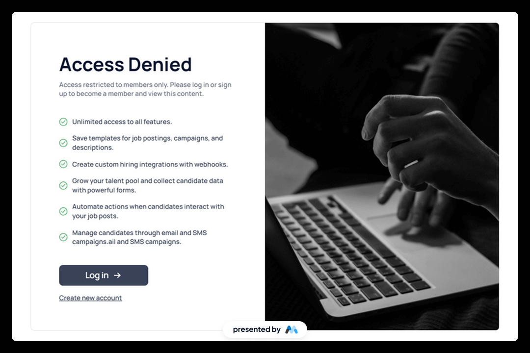The Block Access component is designed to inform users that they do not have permission to access certain features, encouraging them to upgrade their plan or log in. It provides a clear and visually appealing message for restricted access. Key Features Responsive design suitable for various screen sizes Customizable text and links for user actions Includes visual elements such as icons and images Background image support for enhanced aesthetics User-friendly layout with clear call-to-action buttons Design Elements: Flexbox layout for centering content Soft color palette with a light background and dark text Use of icons for visual appeal Rounded button styles for a modern look Consistent typography with a focus on readability Potential Use Cases: Web applications requiring user authentication Membership sites with tiered access levelsE-commerce platforms with restricted product features SaaS products needing user upgrade prompts Educational platforms with course access limitations Conclusion: The Block Access component is a versatile solution for managing user access, effectively combining functionality with an appealing design to enhance user experience.