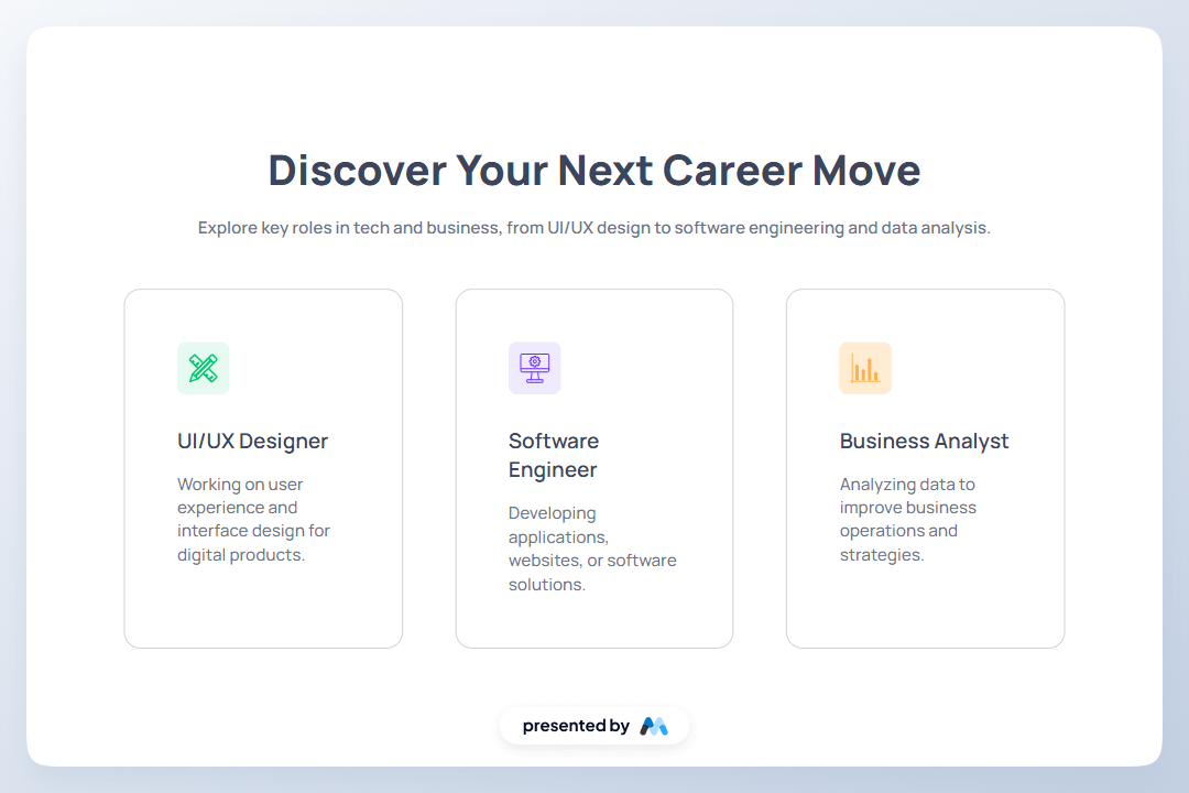 AeroKit UI Feature06 Light is a Webflow component designed to showcase various career paths in tech and business. It features a clean layout with sections for images and text, making it suitable for displaying information about different roles such as UI/UX Designer, Software Engineer, and Business Analyst.