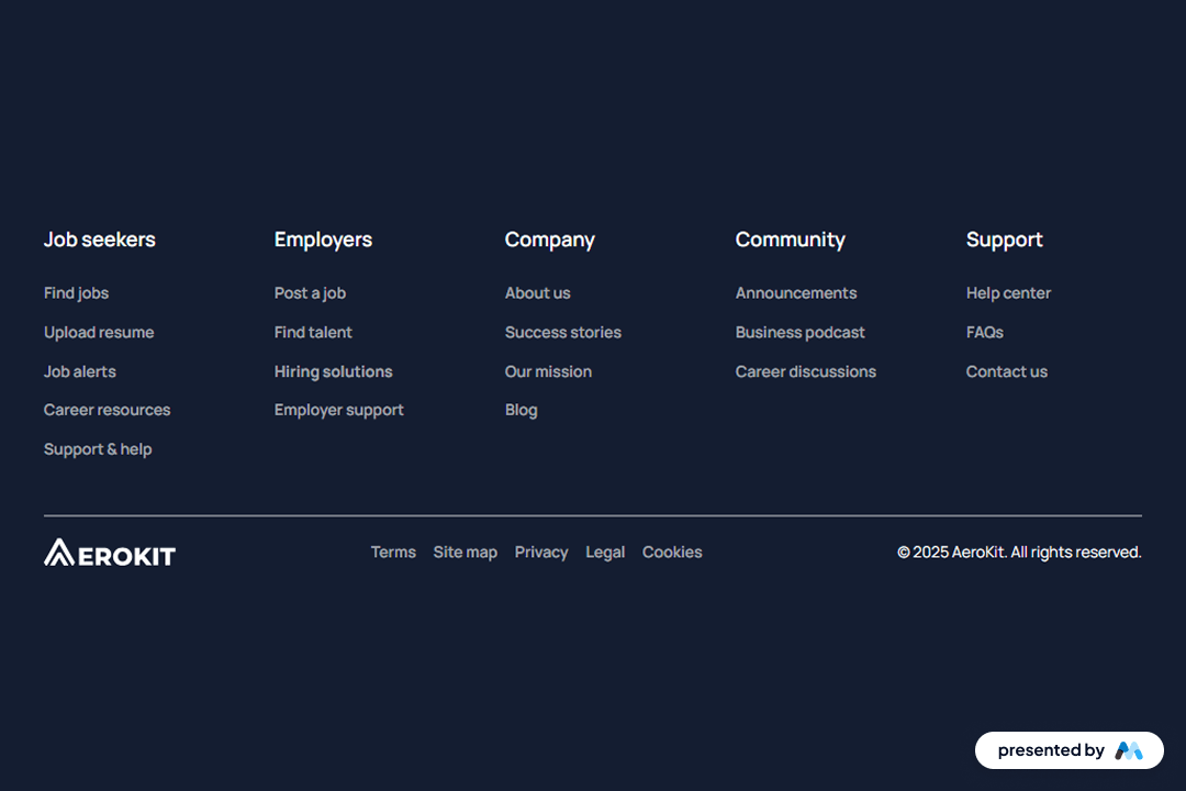 The AeroKit UI Footer02 Links Hub is a Webflow component designed to provide a structured footer area for websites, featuring various links and sections that enhance navigation and accessibility. It is particularly useful for job-related websites, offering links for job seekers and employers.