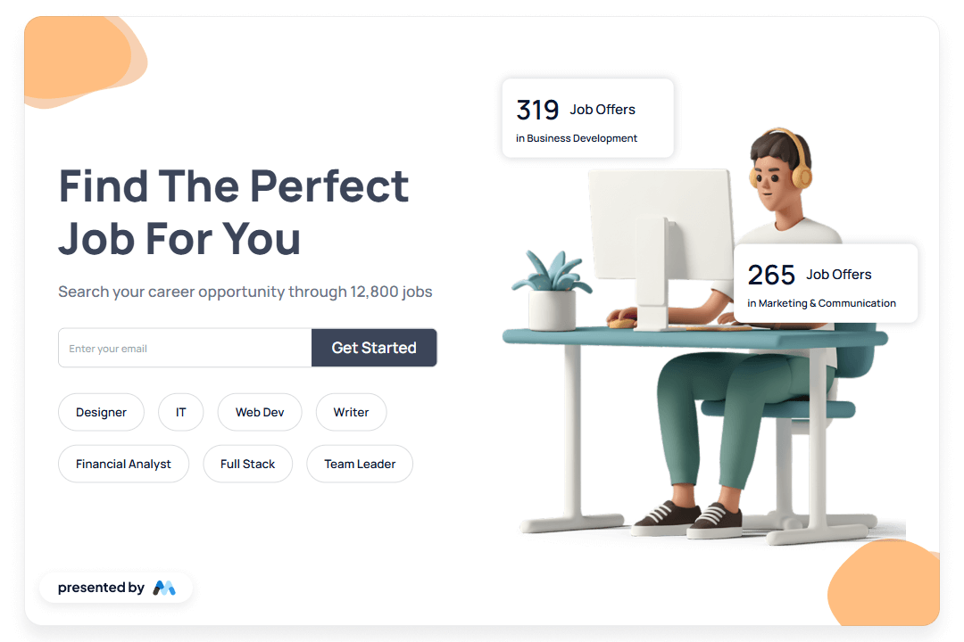 • Job boards or recruitment websites looking to attract job seekers.Corporate websites needing a professional landing page.Marketing campaigns that require a strong visual presence.Educational platforms promoting courses or programs.Startup websites aiming to capture leads through email subscriptions.