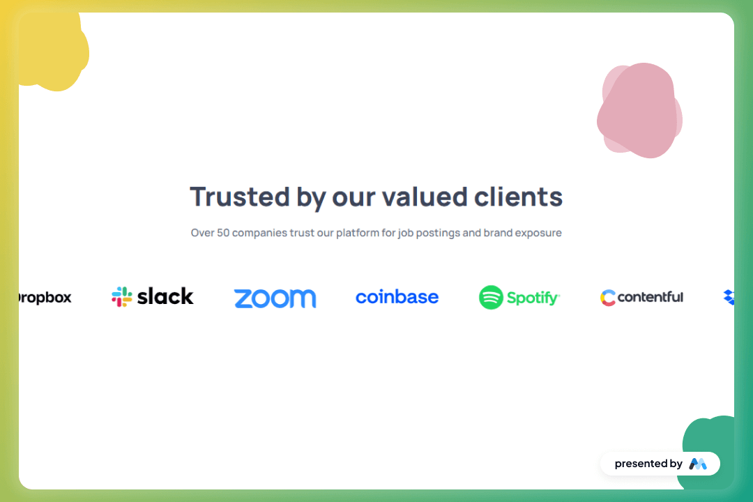 • Corporate websites wanting to display client logos for credibility.Freelancer portfolios showcasing collaborations with notable brands.Landing pages for services that require client testimonials.E-commerce sites highlighting partnerships with popular brands.
