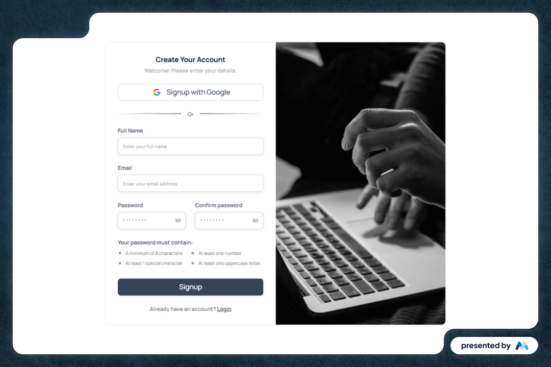 • Dual-pane layout for improved user interaction.Form fields for full name, email, password, and confirmation password.Social media sign-up option with Google integration.Responsive design with focus states for accessibility.Customizable styles for text and layout.