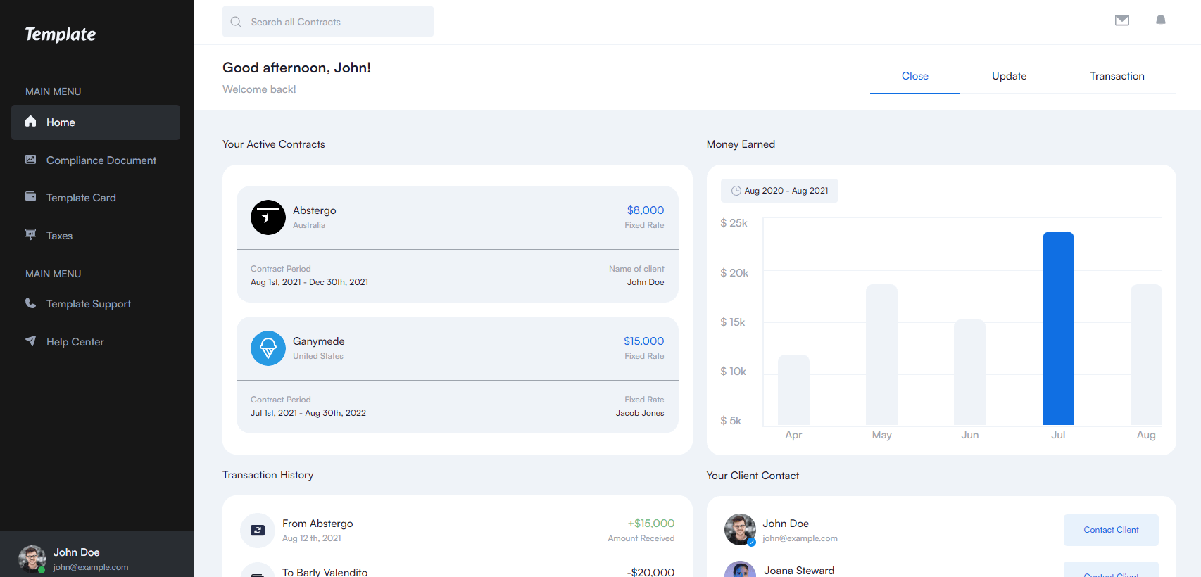 • Sleek, modern designFinancial graphs for data visualizationActive contract displaysUser-friendly navigationResponsive layout for various devices