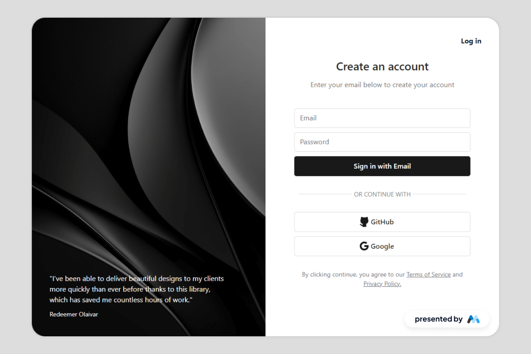 • Clean and modern designSupports email and password loginOAuth login options for GitHub and GoogleResponsive layoutIncludes a testimonial section