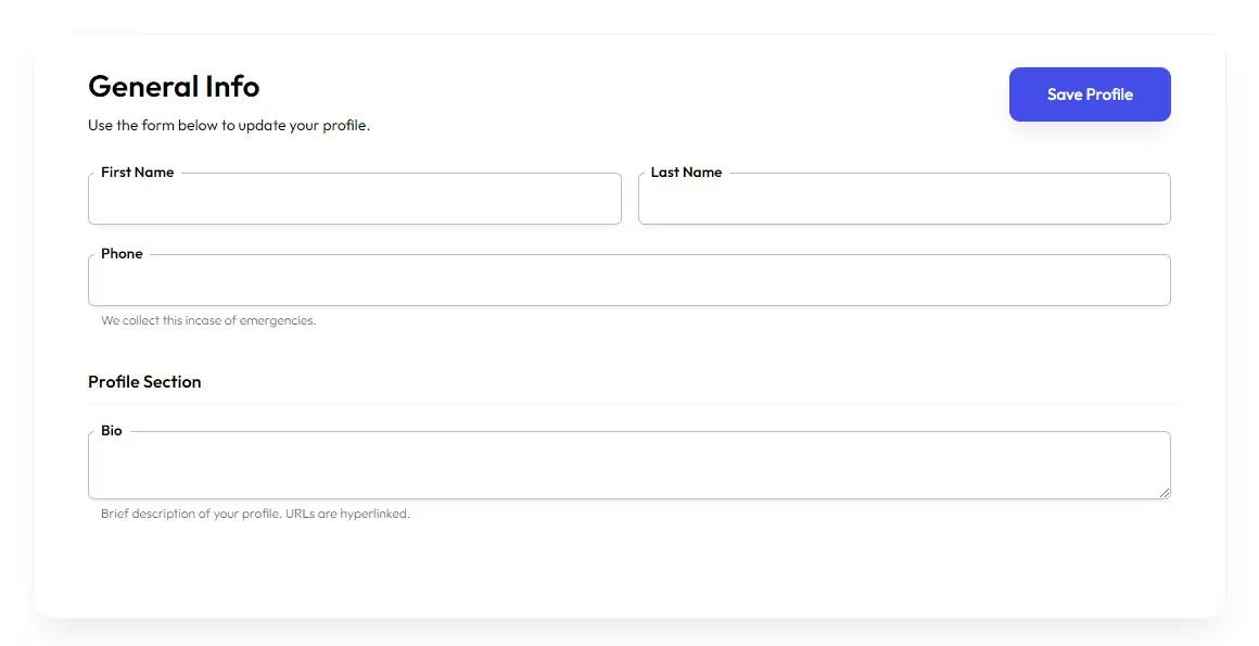 The Component Profile Form is designed to allow users to easily update their profile information through a structured form interface. It includes fields for personal details such as name, phone number, and bio.
