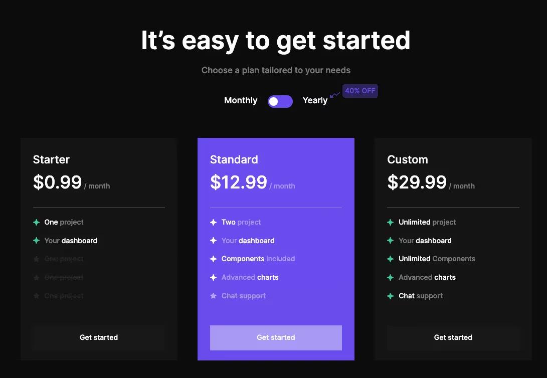 • Conclusion: The Dark Mode Pricing component is versatile and visually appealing, making it an excellent choice for businesses aiming to present their pricing plans in a modern and user-friendly manner.