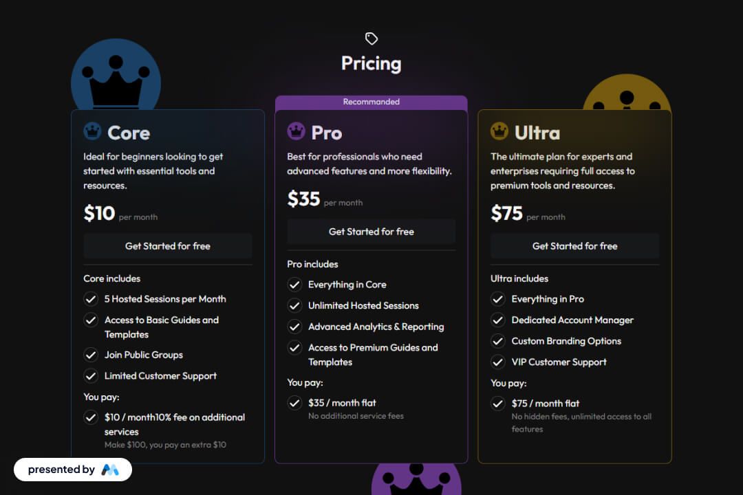 • Dark background with contrasting text for improved readability.Use of icons to visually represent features included in each pricing tier.Grid layout that organizes pricing options neatly, enhancing user experience.Typography that emphasizes key information, such as pricing and features.