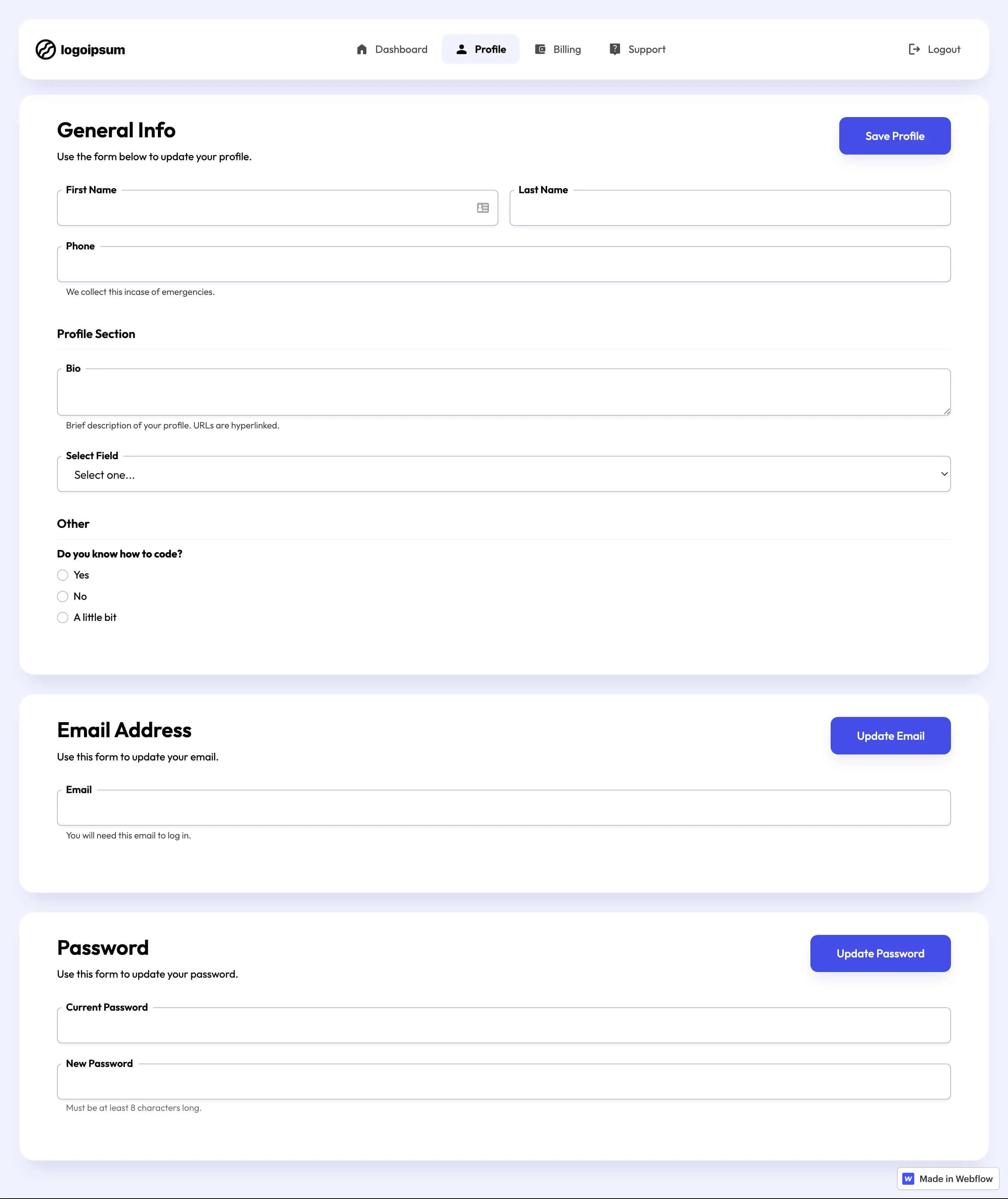 The Unstyled Profile Form is a simple and functional form designed for users to update their profile information. It includes fields for first name, last name, and phone number, along with success and error messages. Key Features Customizable fields for first name, last name, and phone number Success message upon successful submission Error message for submission failures Lightweight and easy to integrate into existing designs Design Elements Minimalist design with no predefined stylesFlexbox layout for form elementsResponsive design suitable for various screen sizes Potential Use Cases User profile management for web applications Membership sites requiring user information updatesE-commerce platforms for customer account management Community forums for user profile editing Conclusion: The Unstyled Profile Form offers a straightforward solution for user profile updates, making it versatile for various applications while allowing for easy customization to fit different design aesthetics.