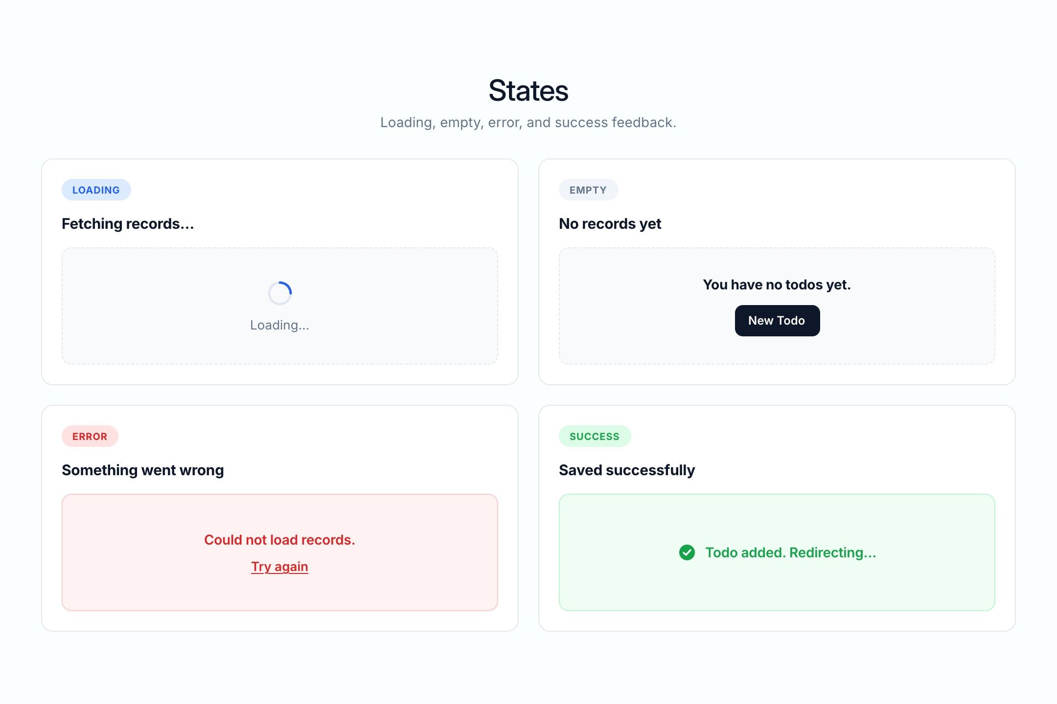 Recommended pairing: always include a visible call-to-action button inside or next to the empty state (e.g. "New Todo", "Add Record", "Invite a member").