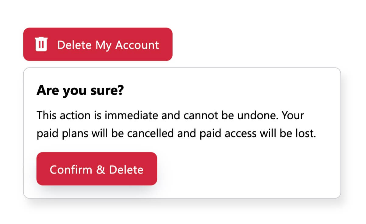 - Dropdown toggle for initiating the delete action, which includes an icon for visual indication.Confirmation message asking 'Are you sure?' to prevent accidental deletions.Warning text indicating that the action is immediate and cannot be undone.Dynamic content display for users with active paid plans, informing them that their access will be lost.