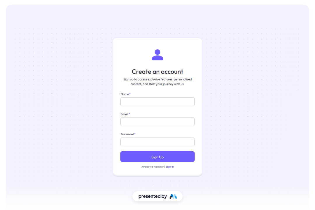 The Mobile First Sign Up component features an onboarding slider that allows users to choose their signup method without distractions. It is designed to integrate seamlessly with Memberstack and is open-source. Key Features Onboarding slider for user-friendly navigation Integration with Memberstack for membership management Open-source for customization and flexibility Responsive design optimized for mobile devices Design Elements Bright color scheme with a focus on usability Rounded corners and soft shadows for a modern look Social media sign-in options for convenience Clear typography and intuitive layout Potential Use Cases Startups looking to create a user-friendly signup processE-commerce websites needing a streamlined registration form SaaS platforms wanting to enhance user onboarding Educational platforms requiring user account creation Nonprofits seeking to engage users through easy sign-up Conclusion: The Mobile First Sign Up component is a versatile and visually appealing solution for any business looking to simplify the user registration process while ensuring a smooth onboarding experience.