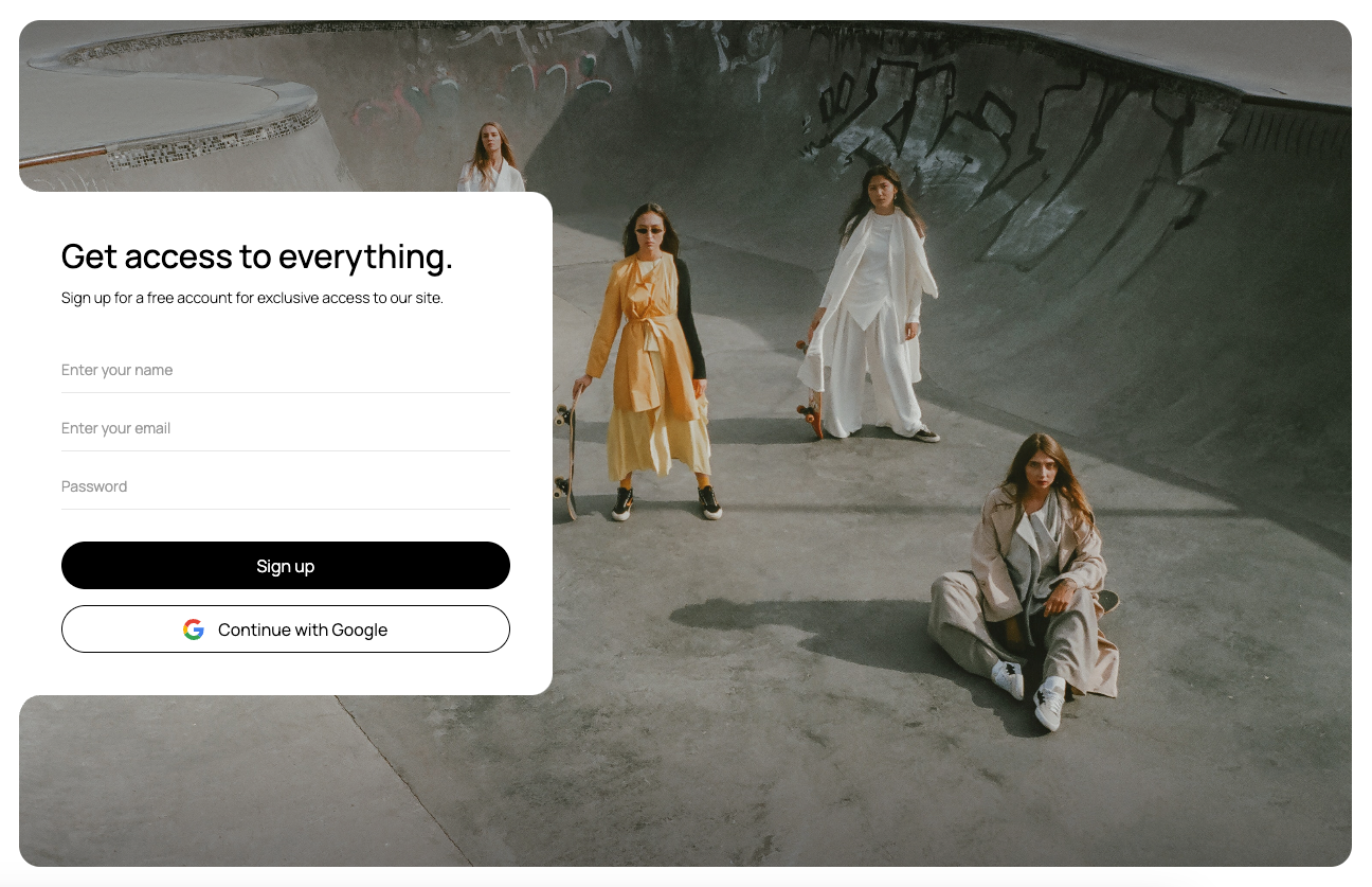 This component is designed for fashion-related websites, providing a stylish and user-friendly sign-up form for visitors. It includes essential fields for email and password registration, along with social media login options.