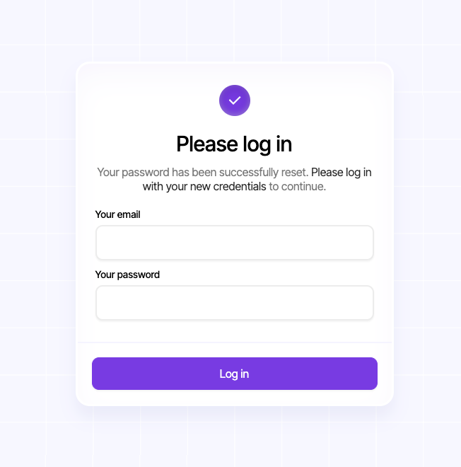 This component provides a simple, unstyled interface for informing users that their password has been reset. Key Features Includes a link back to the login pageDesign Elements: Minimalistic design with no predefined styles Uses standard HTML elements such as forms, headings, and labels Responsive layout suitable for various devices Potential Use Cases: Web applications requiring user authenticationE-commerce platforms needing secure password recovery Membership sites with user accounts Any service that requires user login and password management Conclusion: The Unstyled Forgot Password - 3 component is a versatile and functional solution for password recovery, ideal for developers looking for a straightforward implementation without design constraints.
