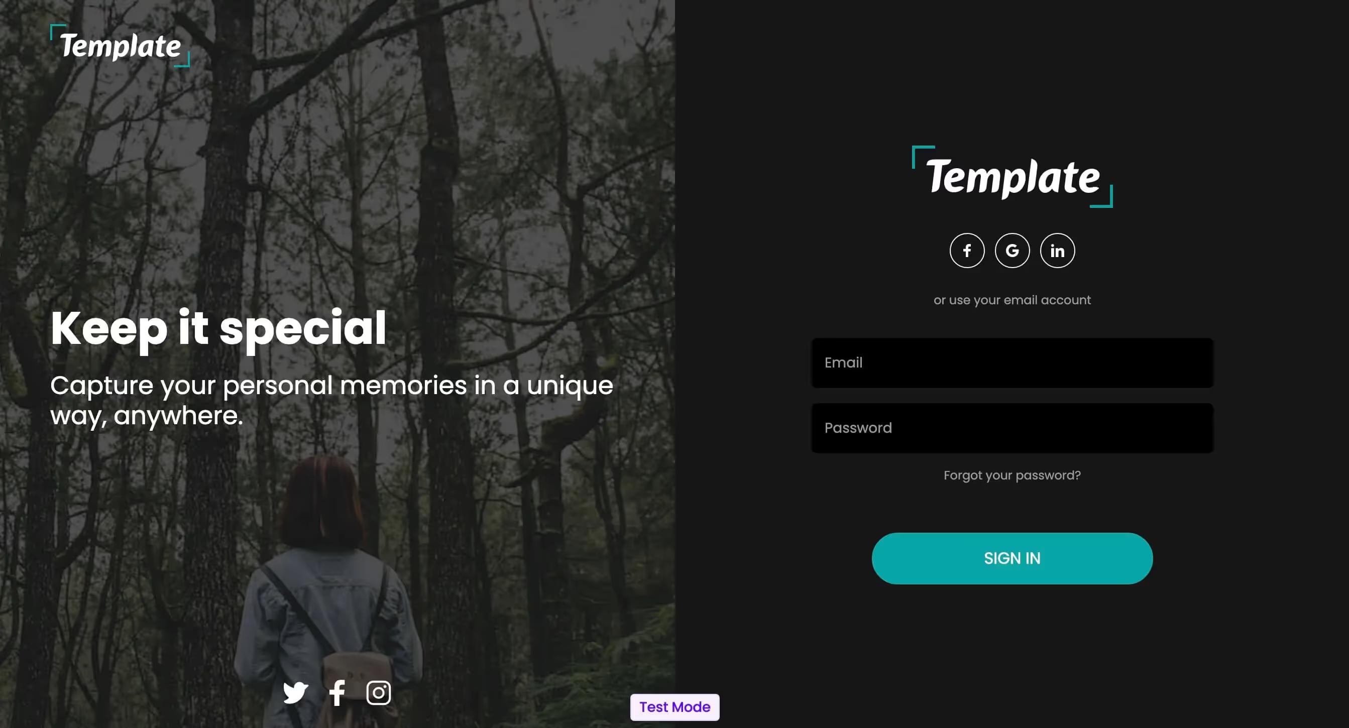 • Includes social media login options (Facebook, Google, Linked