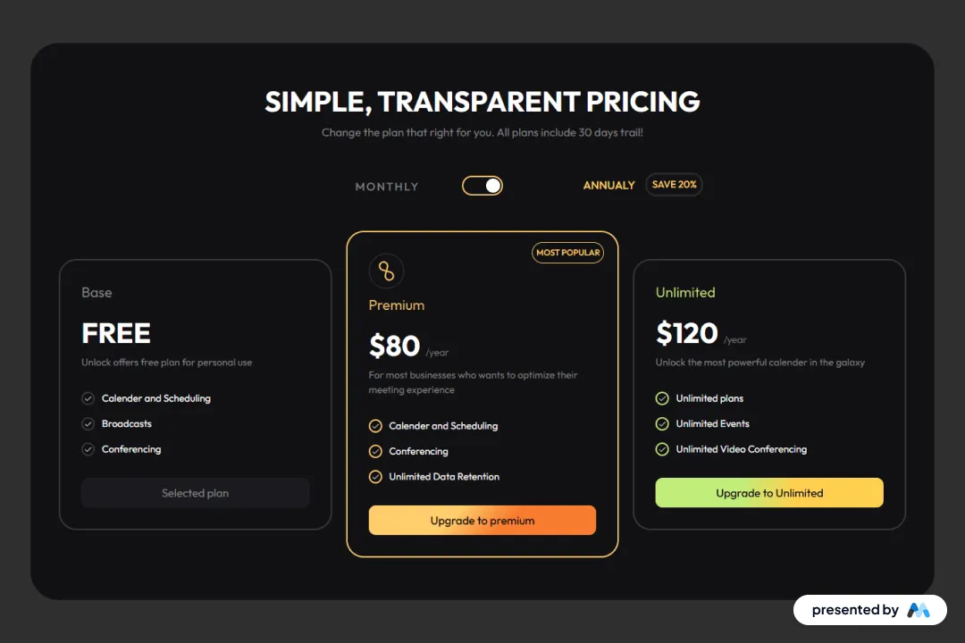 The Free Price Page is a visually appealing pricing component designed to showcase various subscription plans with clear pricing details and features. It utilizes a tabbed interface for easy navigation between different pricing options.