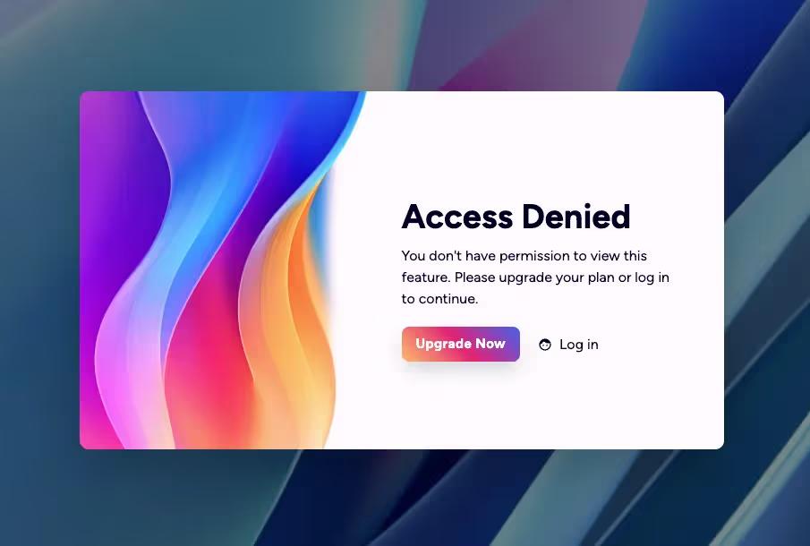 The Block Access component is designed to inform users that they do not have permission to access certain features, encouraging them to upgrade their plan or log in. It provides a clear and visually appealing message for restricted access. Key Features Responsive design suitable for various screen sizes Customizable text and links for user actions Includes visual elements such as icons and images Background image support for enhanced aesthetics User-friendly layout with clear call-to-action buttons Design Elements: Flexbox layout for centering content Soft color palette with a light background and dark text Use of icons for visual appeal Rounded button styles for a modern look Consistent typography with a focus on readability Potential Use Cases: Web applications requiring user authentication Membership sites with tiered access levelsE-commerce platforms with restricted product features SaaS products needing user upgrade prompts Educational platforms with course access limitations Conclusion: The Block Access component is a versatile solution for managing user access, effectively combining functionality with an appealing design to enhance user experience.