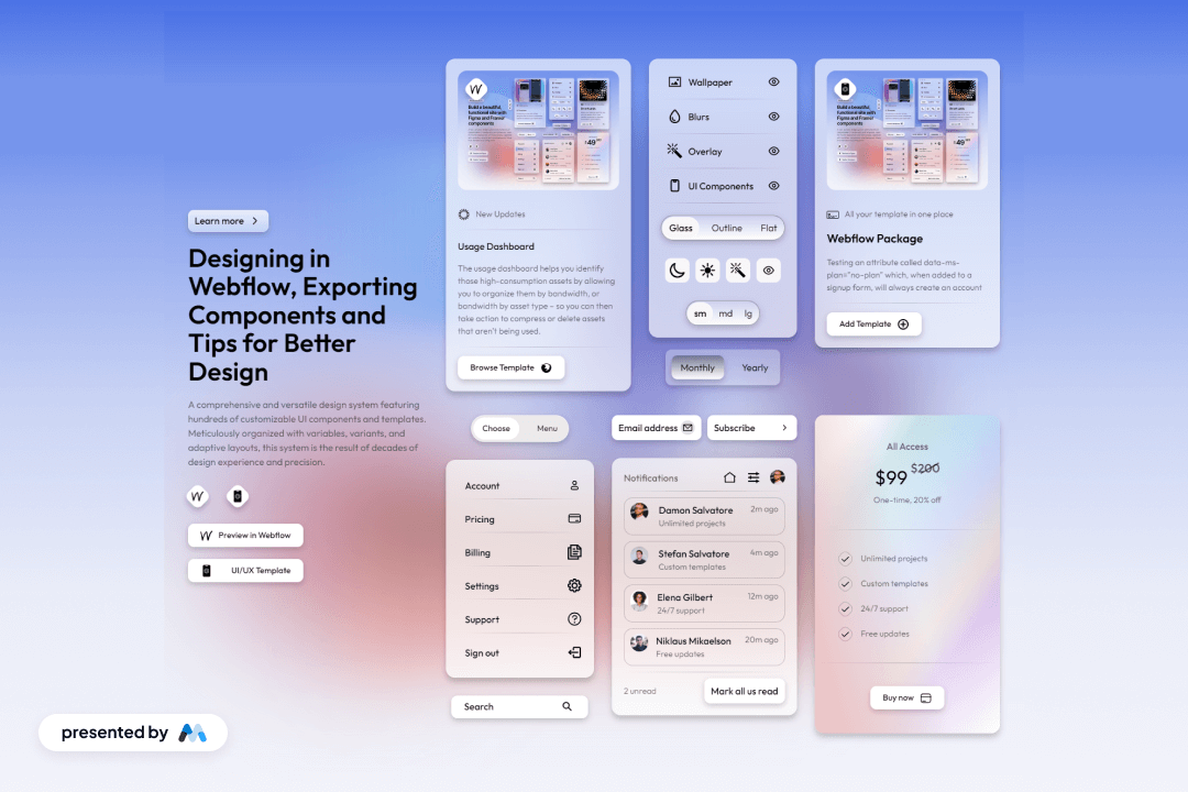 The Gradient UI Kit is a comprehensive design system that provides a variety of customizable components such as pricing plans, buttons, and user dashboards, all featuring a clean and modern aesthetic. It integrates seamlessly with Webflow, offering easy-to-use templates and clear calls-to-action.