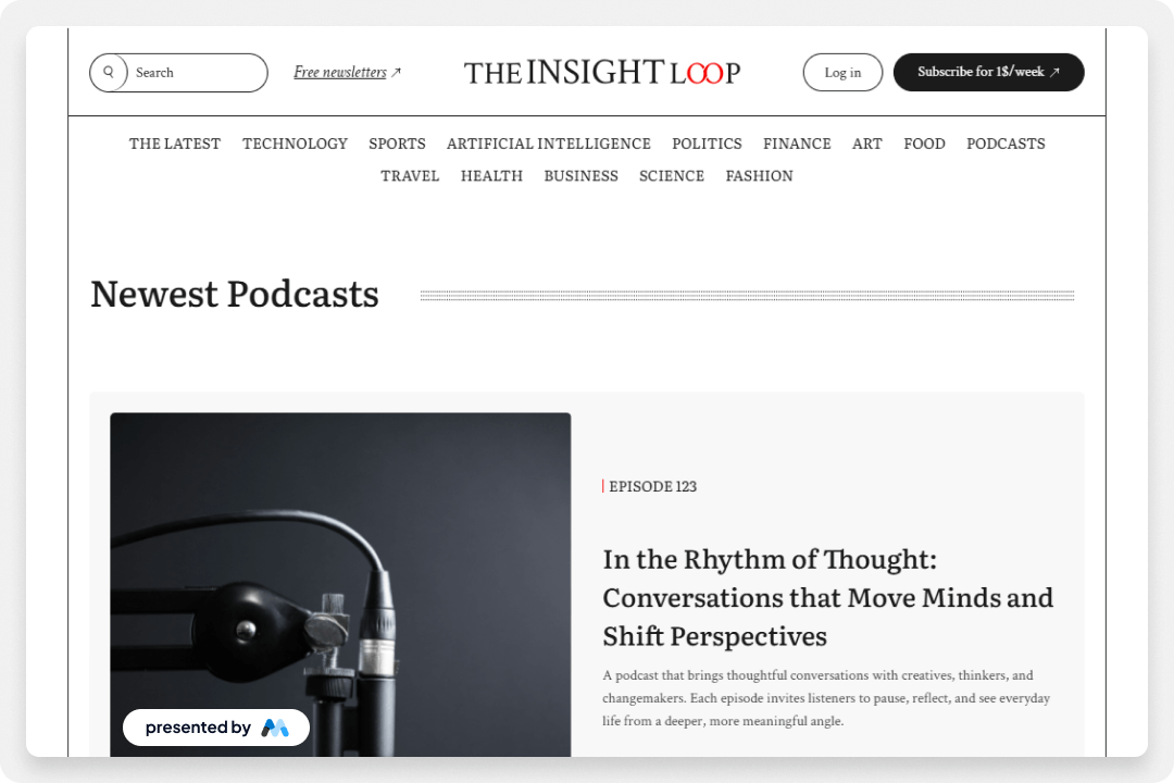 The Insight Loop UI Kit Podcast Page is designed for podcast creators and developers looking to build a dedicated page for their podcast series. It features a clean layout with sections for episodes, subscription options, and a newsletter sign-up, making it easy to engage with listeners and promote content.