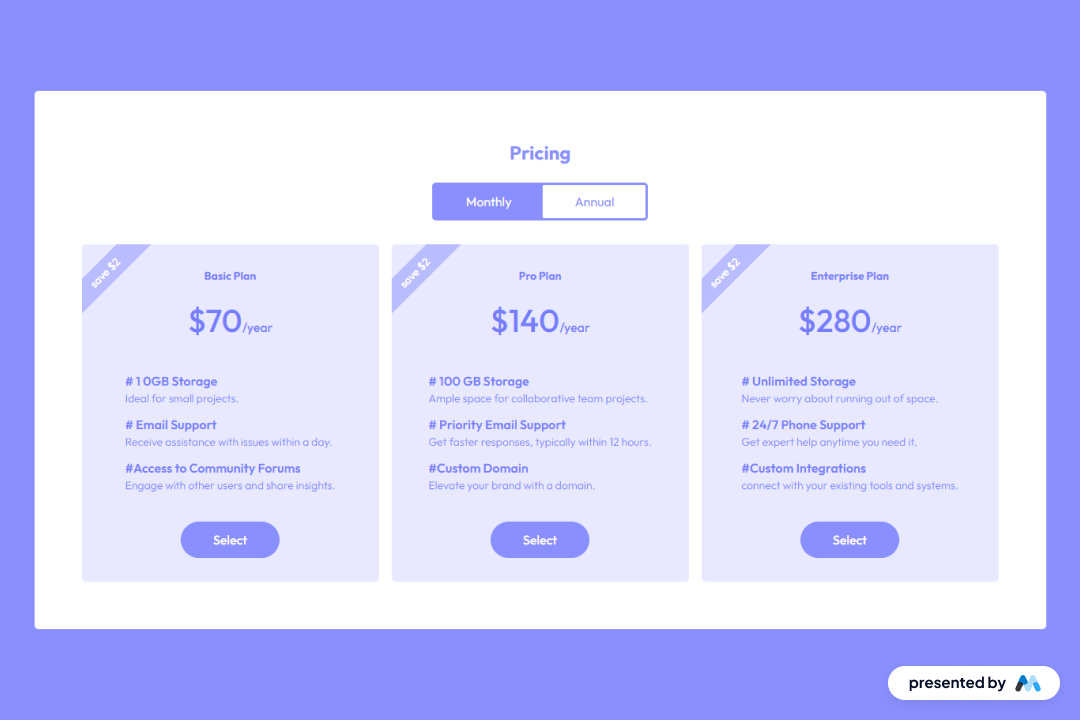 • Tabbed interface for switching between monthly and annual pricing options.Grid layout for displaying multiple pricing plans side by side.Customizable text fields for plan names, prices, and features.Responsive design that adapts to different screen sizes.