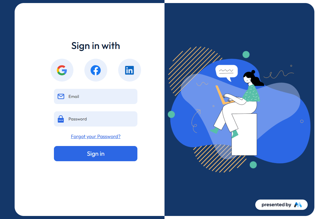 • Includes fields for email and password input, enhancing user accessibility.Social media login options for Google, Facebook, and Linked