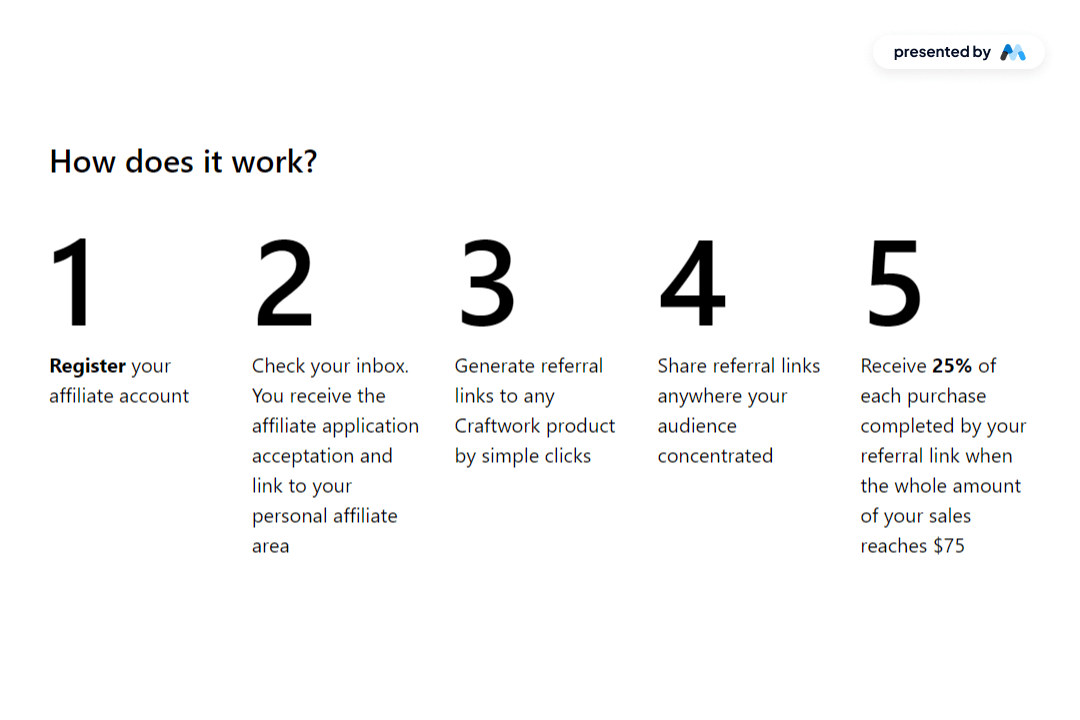 Craftwork's affiliate program allows users to earn a 25% commission on every purchase or subscription through easy registration and promotional opportunities. Key Features Simple registration processSupports various marketing strategiesDesign Elements: Modern and clean layout Use of vibrant colors like yellow and black Incorporation of SVG images for clarity Responsive design for mobile and desktop Potential Use Cases: Online marketers looking to monetize their audience Bloggers and content creators promoting products Businesses seeking to expand their sales channels Influencers wanting to earn through affiliate linksE-commerce platforms wanting to incentivize referrals Conclusion: The 'Become an Affiliate' component is a versatile tool for driving sales and engagement, making it ideal for various online marketing strategies.