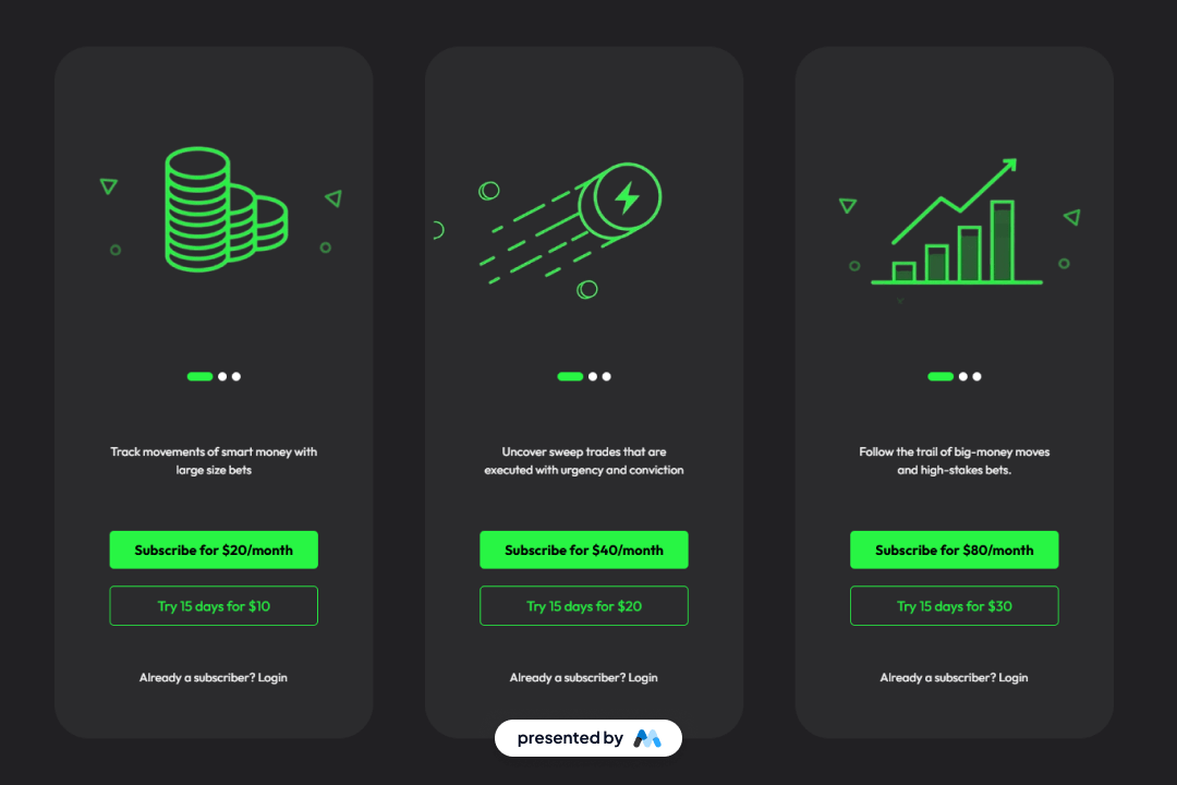 • Image slider for showcasing multiple plans or features, enhancing visual engagement.Responsive design that adapts to various screen sizes, ensuring accessibility on mobile devices.Customizable pricing options with clear subscription details, such as 'Subscribe for $20/month' and 'Try 15 days for $10'.Focus state styles for improved accessibility, allowing keyboard navigation.CSS classes for managing spacing and alignment, ensuring a consistent layout.