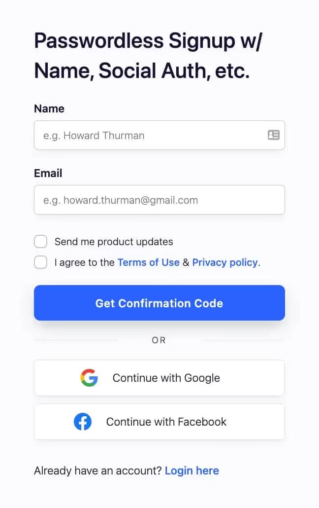 This component facilitates user registration without passwords, allowing users to sign up using their email and social media accounts. It enhances user experience by simplifying the signup process.