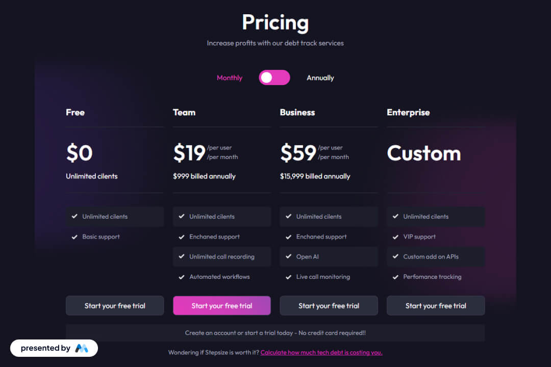 • Tabbed interface for switching between monthly and annual pricing options.Clear headings and descriptions for each pricing tier.Visual indicators for features included in each plan, such as unlimited clients and basic support.Call-to-action button for starting a free trial.
