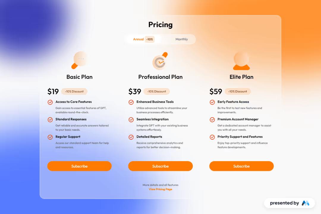 • Conclusion: The Premium Gradient Plans template is a versatile and visually appealing component that effectively communicates pricing options, making it an excellent choice for businesses aiming to enhance their subscription offerings.