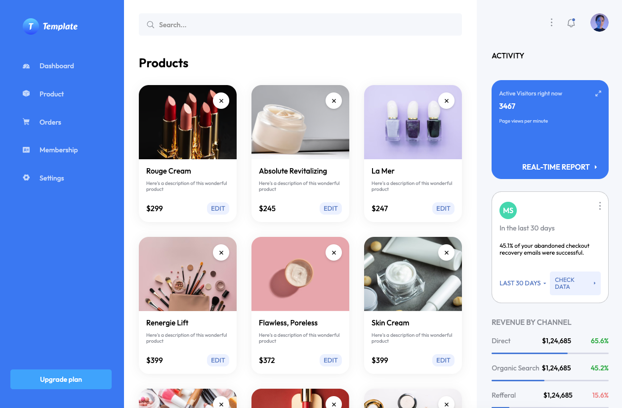 A blue and white themed dashboard UI template designed for product management, featuring a product grid layout.