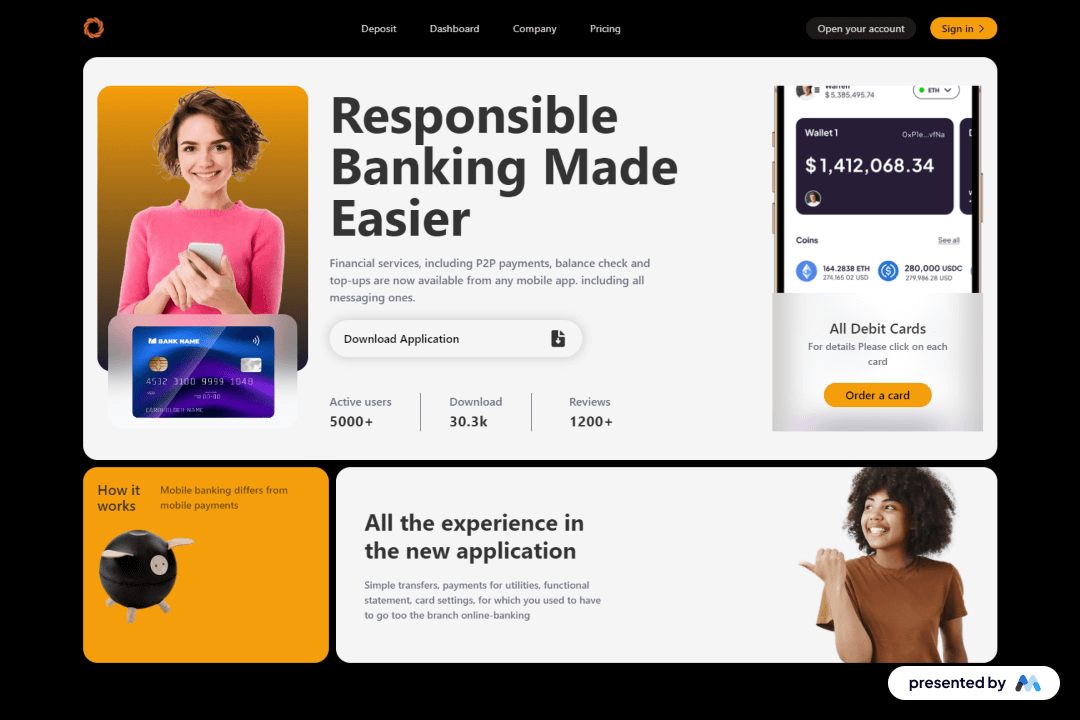 • Responsive Navbar with links to Deposit, Dashboard, Company, and Pricing sections.User account management options including 'Open your account' and 'Sign in' buttons.Dynamic display of user metrics such as active users and downloads.Grid layout for showcasing images and information effectively.Customizable CSS for text styling and layout adjustments.